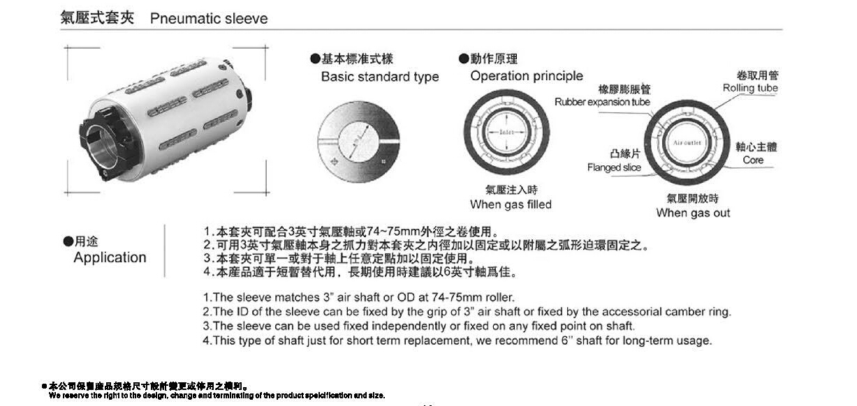 氣壓式套夾廣泛應用于包裝薄膜行業,而且氣脹套的主要規格尺寸是3英寸轉6英寸氣脹套,所以說氣脹套都是結合氣脹軸一起使用的。在氣脹套的結構種類來分的話,有鍵式氣脹套;板式氣脹套;橡膠氣脹套等。它廣泛應用于包裝印刷行業等,深受廣大朋友的認可與喜愛。